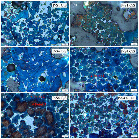 Figure 8. Microstructure of clinker minerals ((a): C3S of P-S1, (b): C2S of P-S1, (c): C3S of P-S4, (d,e): C2S of P-S4, and (f): f-CaO of P-S4).