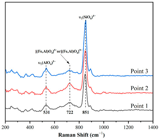 Figure 8 shows the effect of sandstone fineness on clinker microstructure, which was observed using optical microscopy. As shown in Figure 8a, the C3S has a small size, a distinct boundary, and its crystal shape is primarily columnar and hexagonal flake for P-S1. In contrast, the C3S exhibits a larger size, a less defined boundary, and an irregular shape for P-S2 (see Figure 8c). Furthermore, as illustrated in Figure 8c, a small quantity of C2S is observed to be wrapped by C3S in P-S4. The size of C2S is uniform, measuring between 10 and 30 μm, and its crystal shape is brain-like and pockmarked for P-S1 (see Figure 8b). The number of C2S is significantly higher in P-S4 than in P-S1, and two morphologies of C2S are found in P-S4 (see Figure 8d,e). Some C2S is relatively small in size, exhibiting clear crossed twin-crystal streaks and a circular morphology (see Figure 8d). On the contrary, the other C2S is comparatively large in size, with clear edges and corners (see Figure 8e), and it bears a resemblance to C3S. To ascertain this phase, three points were selected for identification by Raman spectroscopy (see Figure 9). The fluctuations exhibited in their Raman spectra are all the same. This observation serves to substantiate the conclusion that the phases in question are indeed identical, thereby validating the determination that the phase depicted in Figure 8e is C2S. Figure 8f shows the f-CaO in P-S4. The f-CaO is generally distributed in small piles, and the surface of f-CaO is colored pockmarked after being corroded by the nitric acid-ethanol solution.