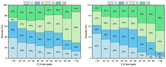 Figure 10. Proportion of crystal content in the same particle size range of C3S and C2S in all clinkers.