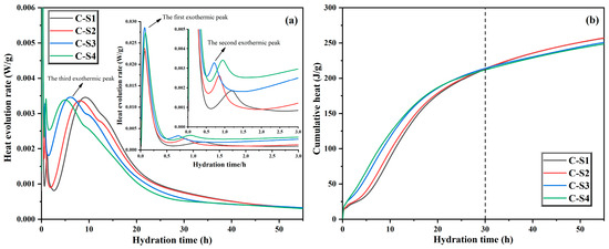 The cumulative heat of all samples is shown in Figure 12b. Within 30 h of hydration, the cumulative heat of C-S3 and C-S4 was higher than that of C-S1 and C-S2. However, the content of C3S in C-S1 and C-S2 was significantly higher than that in C-S3 and C-S4. With the continuous hydration of C3S, the cumulative hydration heat of C-S1 and C-S2 exceeded that of C-S3 and C-S4 after 30 h due to the presence of a greater quantity of C3S.
