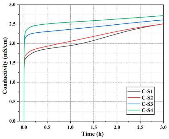 Figure 12 shows the heat flow and cumulative heat of all cements. As shown in Figure 12a, the initial exothermic peak was attributed to the rapid hydration of C3A to produce ettringite (AFt) in the presence of gypsum for all samples [25]. It is evident that the initial exothermic peak of C-S3 and C-S4 is significantly higher than that of C-S1 and C-S2. The second exothermic peak appeared before the induction period for all samples because of the reaction of hemihydrate gypsum with water to form dihydrate gypsum [26]. However, this peak is relatively weak. The third exothermic peak is attributed to the hydration of C3S [27]. A decrease in sandstone fineness results in a reduction of the hydration induction period and advancement of the hydration of C3S. The shoulder peak following the third peak was associated with the renewal dissolution of aluminate and the formation of ettringite (AFt) [28,29]. Figure 13 presents the conductivity measurements of cement during the induction period. The results demonstrate an inverse correlation between cement conductivity and sandstone fineness, attributable to variations in Ca2+ and OH ion concentrations within the cement paste. It has been reported that an increase in the concentration of Ca2+ and OH ions has been shown to promote the nucleation and growth rate of C-S-H gel [30,31,32]. This is consistent with the characteristic features observed in the hydration heat curve.