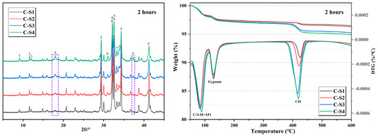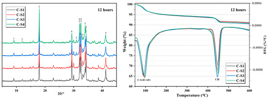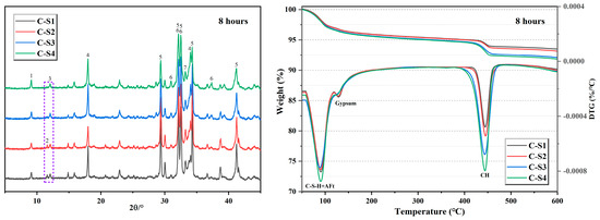 In order to further explore the differences among all samples, the hydration products of cements within 24 h were compared. Figure 14 shows the XRD patterns and TG-DTG curves of cements hydrated for 2 h. At 2 h, the f-CaO diffraction peak (2θ = 37.2°) in XRD patterns of all samples disappeared, while the weak Ca(OH)2 diffraction peak (2θ = 18.0°) appeared, indicating that the f-CaO reacts with water to form Ca(OH)2. Furthermore, the TG curves demonstrated that C-S3 and C-S4 undergo greater mass loss at about 450 °C in comparison to C-S1 and C-S2, which corresponds to the dehydration of Ca(OH)2 [33]. Additionally, the diffraction peaks of AFt (2θ = 9.1°) and gypsum (2θ = 11.6°) also appeared in the XRD patterns. Concurrently, the DTG curves exhibit endothermic peaks of AFt and C-S-H gel at 85 °C and gypsum at 130 °C [33]. When the cements were hydrated for 8 h (see Figure 15), the diffraction peaks of gypsum and its endothermic peaks were absent for C-S3 and C-S4. The rate of gypsum consumption was found to be significantly faster for C-S3 and C-S4 than for C-S1 and C-S2. This phenomenon can be attributed to the higher content of f-CaO in C-S3 and C-S4 reacting with water to form increased amounts of Ca(OH)2. It has been reported that the increase in Ca(OH)2 changes the pH of the cement paste, thereby accelerating the consumption of gypsum [34]. At 12 h of hydration (see Figure 16), the diffraction peaks of gypsum and the endothermic peaks of gypsum disappeared for all samples.