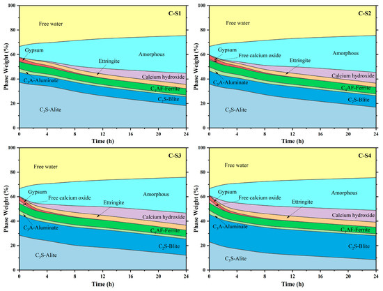 Figure 17 shows the quantitative results for the hydrates of cement pastes at different ages. In the early stage of hydration, C3S and f-CaO hydrate rapidly to form Ca(OH)2, and C3A also hydrates rapidly to form AFt. With the increase in age, the contents of Ca(OH)2 and AFt gradually increase, while the contents of C3S and C3A gradually decrease. Meanwhile, the contents of C2S and C4AF remain relatively constant. The hydration degree of C3A is significantly higher for C-S3 and C-S4 than that of C-S1 and C-S2 (see Figure 18a). This observation can be attributed to the elevated content of Ca(OH)2 in C-S3 and C-S4, which augments the concentration of Ca2+ in the paste and promotes the hydration of C3A [33]. Because of the reaction of more f-CaO and the hydration of more C3A, C-S3 and C-S4 have higher initial exothermic peaks (see Figure 12a) and more accumulated heat within 30 h (see Figure 12b) compared to C-S1 and C-S2. Furthermore, the hydration of C3S is advanced due to the rapid hydration of f-CaO to form Ca(OH)2, which is consistent with the hydration heat (see Figure 12a).