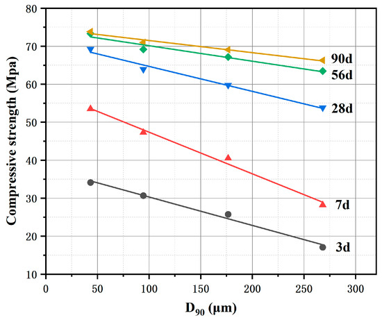 Figure 20 delineates the quantitative correlation between sandstone fineness (D90) and cement compressive strength development. Linear relationships were established between the fineness parameter and strength values across all curing ages, with their statistically derived regression equations and corresponding determination coefficients (R2) tabulated in Table 9.