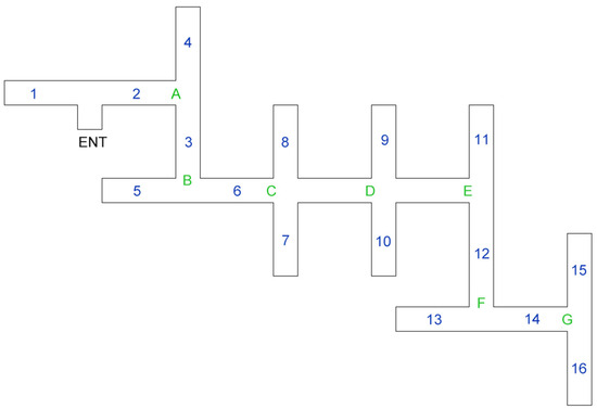 In Figure 1, the coding indicates the following characteristics: 1—Cold color; 2—Warm color; 3—Bright lighting; 4—Dark lighting; 5—No hanging signs; 6—Hanging sign; 7—Floor sign; 8—No floor sign; 9—Hanging sign + floor sign; 10—No signs; 11—Floor sign; 12—Hanging sign; 13—Presence of an obstacle; 14—No obstacles; 15—Narrow passage; and 16—Wide passage.
