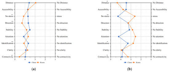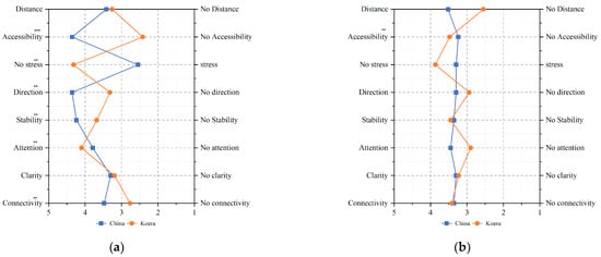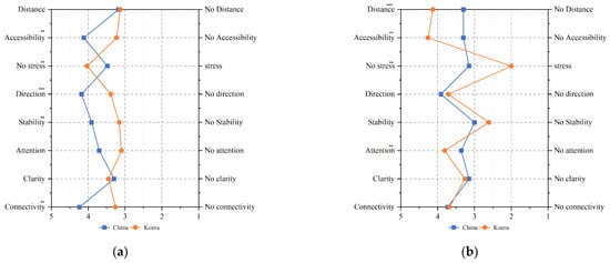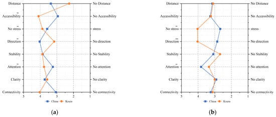 The t-test analysis showed differences between the groups regarding accessibility, stress, sense of direction, safety, and connectivity. Among them, there was a significant difference in choices based on sense of direction. Preferences for wide routes were all less than average, but there was a large difference between Korean and Chinese preferences for wide routes. Group C showed a stronger preference for accessibility, less stress, a more confident sense of direction, greater stability, a longer attention span, and stronger connectivity than Group K (Figure 5a)
