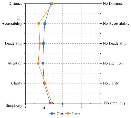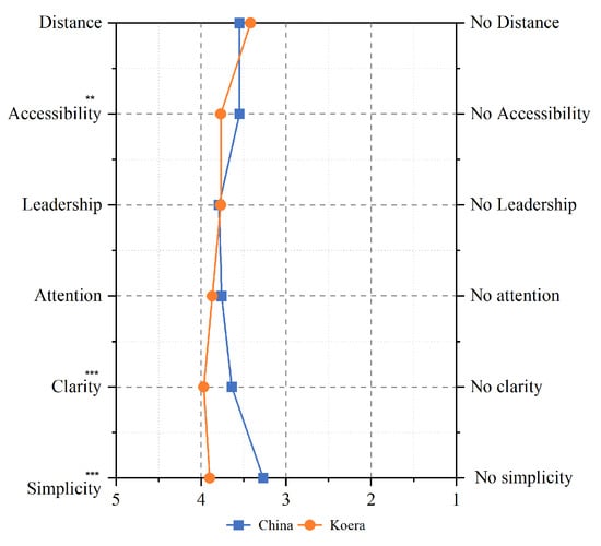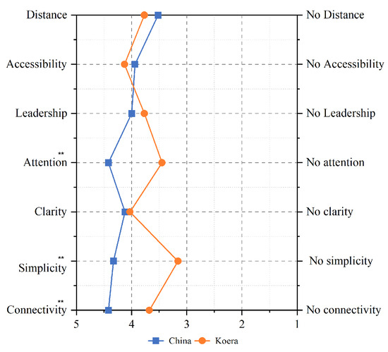 For the passageway with a hanging sign, t-test analysis showed differences between the Chinese and Korean groups in terms of attention, simplicity, and connectivity. Group K showed an above-average preference compared to Group C in terms of distance and accessibility (Figure 9).