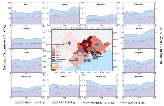 - The building CO2 emissions of the GBA slowly increased to 96.90 Mt CO2 by 2020. P&C buildings accounted for a larger proportion, maintaining emissions at nearly 57%. Electricity dominated the building energy consumption emissions. Shenzhen, Guangzhou, and Hong Kong were responsible for the top three building CO2 emissions values, reaching 15.75, 20.86, and 22.54 Mt CO2 by 2020, respectively.