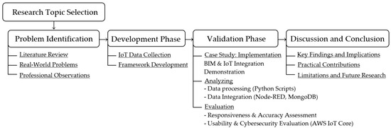 Initially, a literature review defined the study context. The problem identification phase analyzed current FM practices to pinpoint barriers to BIM–IoT integration. We collected IoT data during the development phase. The indicators (occupancy levels and CO2) were primarily selected due to data availability constraints in our case study building. This choice demonstrates practical applicability and highlights how facility managers can effectively utilize integrated IEQ data. Furthermore, we can adapt this approach to other scenarios with different datasets. We then developed a web-based integration framework using IFC-to-JSON data conversion and low-code programming via Node-RED. The validation phase involved a detailed case study in an operational office building, integrating BIM models (IFC) with IoT sensor data (IEQ). Key tools employed included Python scripts for data processing and IFC-to-JSON conversion, Node-RED for IoT data visualization, MongoDB for structured data management, and AWS IoT Core for secure data streaming. Due to cybersecurity constraints limiting direct real-time data streaming from the BMS, this research relied on periodic CSV exports. While this approach enabled secure and practical data integration testing, it inherently restricted the evaluation of full real-time responsiveness and introduced minor delays. Future research should therefore explore secure direct real-time data integration methods to comprehensively assess system performance under actual operational conditions. Finally, this study concludes by discussing interoperability, usability, implications for FM, and future research recommendations.