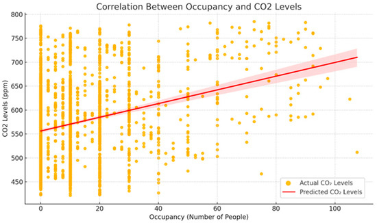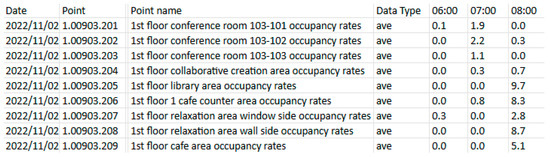 Additionally, Figure 5 illustrates the physical locations of all the installed sensors and their corresponding BIM elements within the studied area, depicting sensor placement and distribution. In this study, we specifically analyzed data from sensor locations SDF 101-16 in the collaborative creation area and SDF 101-28 in the library section. Occupancy rates were measured using sensors that detect human presence via infrared radiation emitted by individuals. CO2 sensors were installed on tables at approximately 1.2 m (standard breathing height per ASHRAE guidelines) above floor level, aligning with recommended standards for accurately capturing air quality conditions within occupant breathing zones.