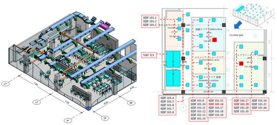 This study utilized a practical case study of a six-story office building located in Kanagawa, Japan. Serving dual functions, the facility operates both as a workspace for employees and as a test environment for advanced building technologies, particularly environmental sensing systems (Figure 3). Detailed BIM data and IoT sensor outputs from this building were essential for this research. This study specifically focused on the first-floor co-working space, which was selected because it provides comprehensive IoT sensor data related to IEQ and is managed and monitored through the building’s centralized BMS. These data were critical for demonstrating and validating the practical integration benefits of BIM–IoT technologies in FM.