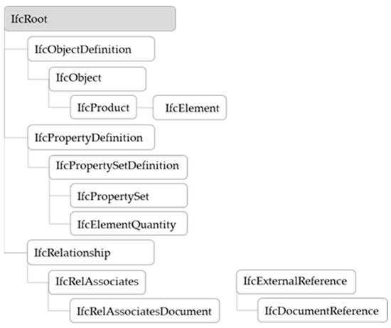 This study specifically adopts the IFC data structure (Figure 6), originating with fundamental entities such as IfcRoot, capturing critical attributes like GlobalId and OwnerHistory. These expand into tangible building elements (IfcElement), including physical components like doors, walls, and mechanical systems. Each IFC element provides metadata essential for asset management operations. Properties associated with these elements are defined either through user-defined attributes in IfcPropertySet (e.g., materials and manufacturers) or standardized measurable parameters (area, volume, and length) through IfcElementQuantity, supporting maintenance scheduling, asset tracking, and lifecycle management decisions.