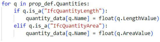 - Asset information (metadata and quantities): Asset metadata was collected from each IfcProduct entity using .get_info(), selectively retaining properties relevant to FM (e.g., Name, GlobalId, PredefinedType, and Tag). We extracted quantitative data embedded within IfcElementQuantity sets, such as area, volume, and length, using the following dedicated Python function (Figure 7).