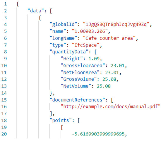 This functionality enables IFC elements to serve as direct access points to external documentation, sensor data platforms, and maintenance records, supporting integrated workflows that include digital logbooks, performance monitoring, and advanced analytical strategies within a unified interface. Following the IFC-to-JSON data conversion using the IfcOpenShell Python library version 0.8.0, the resulting JSON structure organizes key IFC attributes, quantity data, external document references, and simplified geometry. Figure 10 provides an illustration.