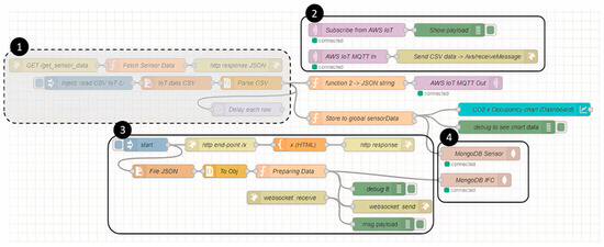 We utilize Node-RED, a visual low-code programming tool, to integrate and visualize BIM and real-time IoT sensor data on a web-based dashboard. This Node-RED workflow (Figure 11) leverages structured JSON data, aligning BIM components with sensor data streams. The Python-based scripts described facilitate the extraction and formatting of BIM data, ensuring accurate and efficient integration.