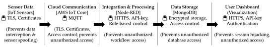 - Real-Time Data Streaming. (2) The parsed sensor data is securely transmitted real-time using the MQTT protocol through AWS IoT Core, an IoT broker providing robust security features such as transport layer security (TLS) encryption and certificate-based authentication. MQTT subscription nodes (AWS IoT MQTT In) ensure secure and continuous sensor data streaming, subsequently relaying these data points to the dashboard for instantaneous visualization. This robust security architecture guarantees reliable and secure data flow between the BMS and the visualization components;
