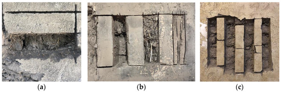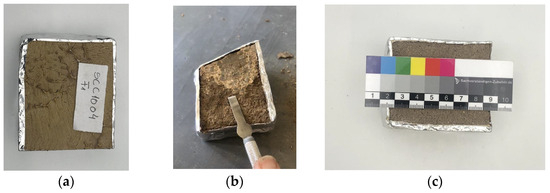 Figure 3. Specimens for the hygroscopicity test: (a) SCC10_04 specimen with finishing; (b) SCC10_03A specimen with the finishing layer being removed; (c) MSJJVV_02 specimen without the finishing layer, with aluminum tape and scale for area measurement.