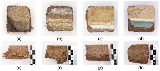 Figure 2. Stratigraphy of the finishings (last finish layer on the top) of specimens: (a) SCC10_02; (b) SCC10_03A; (c) SCC10_04; (d) MSJJVV_02. Lateral views of the earthen layers (earth and sand on the top, earth and fibers on the bottom) of specimens: (e) SCC10_02; (f) SCC10_03A; (g) SCC10_04; (h) MSJJVV_02.