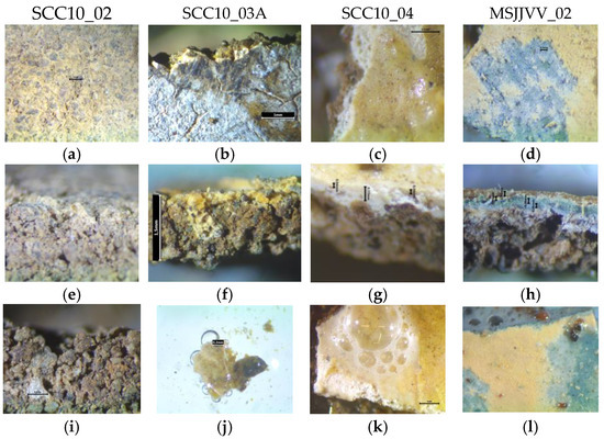 Figure 4. Microscope photographs from the finishing layers of the coating samples studied. Each column corresponds to a sample. Surface view at the top: (a) SCC10_02; (b) SCC10_03A; (c) SCC10_04; (d) MSJJVV_02. Lateral view in the middle and bottom: (e) SCC10_02; (f) SCC10_03A; (g) SCC10_04; (h) MSJJVV_02; (i) SCC10_02 with presence of lime nodule. Reaction to hydrochloric acid solution at the bottom: (j) SCC10_03A; (k) SCC10_04; (l) MSJJVV_02.