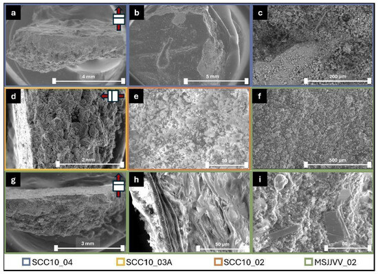 Figure 5. SEM images showing the morphological features of the finishing layers of different samples, defined by border color: (a) fragment cross-section; (b) fragment surface; (c) surface zoom; (d) fragment cross-section; (e) surface crystalline deposition; (f) superficial paint covering; (g) fragment cross-section; (h) wallpaper; (i) aggregates in the gypsum layer. Note: In the cross-section pictures, an arrow shows the sample orientation with the end pointing along the surface.