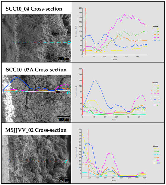 The linear measurements show a clear change from a first layer rich in calcium carbonate to a secondary layer of earthen base mortar, standing in the first 200 µm for SCC10_04 and SCC10_03A, and 400 µm for MSJJVV_02. This is underlined by the shift of high intensity values from Ca, O, and C to Si, Al, and O, which are characteristic of quartz and aluminosilicates. The result can be explained by considering that the surfaces of these materials have been flattened, during conservative treatment, with a commercial product called Pasta muro interior, which has a high composition of calcium carbonate (60–70%) [24].