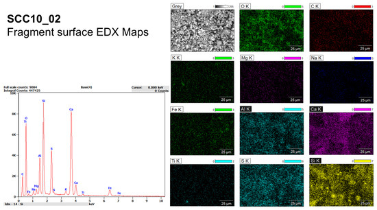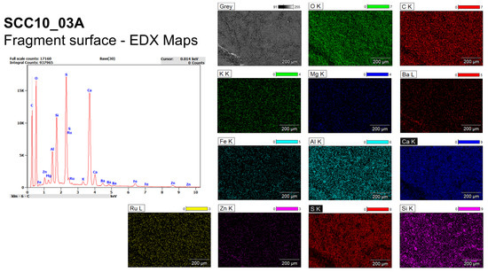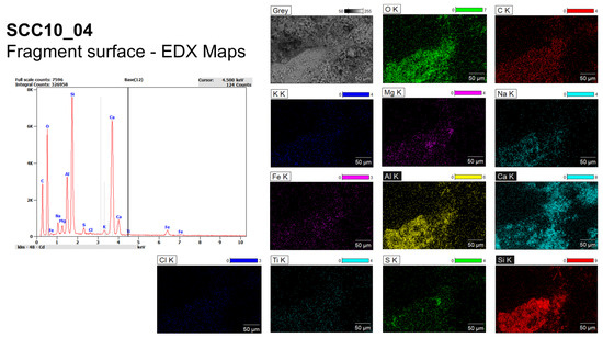 The surface of the samples SCC10_04, SCC10_03A, and SCC10_02 show high signals of sulfur, calcium, and oxygen, which might be related to the presence of gypsum. Given the fact that the fragments come from building walls located in a very polluted part of the city, it is possible to attribute this presence to a sulfation of the calcium carbonate denoted in the linear measurements [25], and not the finishing initial composition.