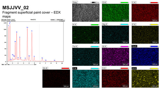 The 2D-EDX mapping of the superficial paint finishing in sample MSJJVV_02 suggests the use of inorganic-based pigment in the preparation of the finishing layers. The presence of Ti high signals might indicate the use of rutile (TiO2), another frequent pigment used to obtain a white covering [26]. As in samples SCC10_04, SCC10_03A, and SCC10_02, the signals related to gypsum are responsible for a major part of the superficial composition of the samples.