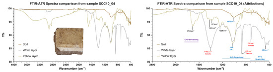 Other traces of gypsum were identified in patinas of different colors, such as the yellow and ochre patinas separated in sample SCC10_3A during the microscopical observation (analyzed simultaneously with the ATR module, “yellow layer” in Figure 11, sample SCC10_3A) or the green patina from sample MSJJVV_02. In the case of the brighter patinas, this supports the hypothesis of the use of a gypsum-based aqueous pigment to decorate the finishing layers. On the other hand, the deposition of gypsum is usually related to a rugosity increase [25]. This allows dust or smoke to further accumulate, presumably resulting in the grey patina observed.