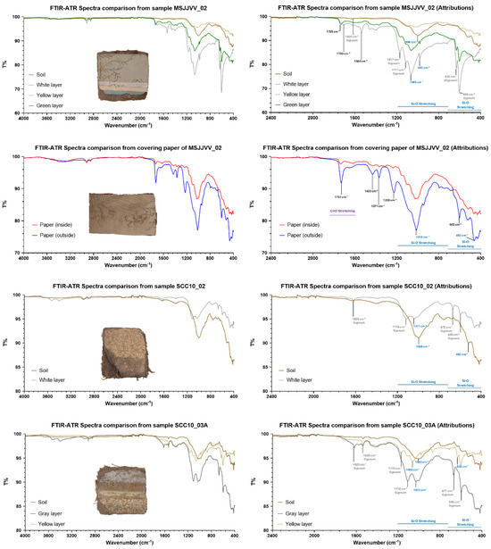 Further characterization of the finishing layer with FTIR-ATR added more insights related to fabrication methods. Figure 11 shows the infrared (IR) spectra of each material, along with the chemical attribution of the main functional groups and the IR spectra of their respective earth as a reference.