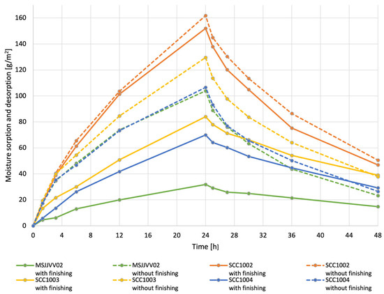 As for the SCC10_02 sample’s coating, the values of sorption are similar, and the desorption performance reached, both with and without finishing, 69% of the sorption value, as shown in Table 2.