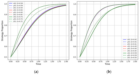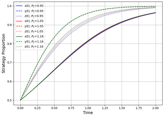 Figure 7 examines how a higher-level authority may impose an additional penalty (PC) on local government if it fails to promote digital adoption effectively. When PC = 0, local administrators lack external pressure, often hesitating to enforce strict regulations or to make advanced oversight investments. As PC rises to moderate or high levels, local government strongly favors “active regulation” right from the start, quickly converging on a near-certain regulatory stance. Still, relying solely on top-down penalties can result in superficial or short-term compliance if the higher-level mandate is not paired with adequate resources, technical guidance, or realistic implementation timelines.