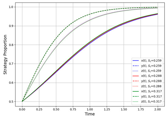 Figure 6 illustrates how varying government subsidy (Sc) for the contractor can reshape strategic behavior within the evolutionary game. If Sc is too low, the contractor faces high up-front costs with minimal offsetting benefits, potentially remaining indifferent or even defaulting to noncooperation to avoid digital overhead. Conversely, overly generous subsidies run the risk of moral hazard or resource misallocation, wherein the contractor superficially invests in digital tools just to secure the funds, without genuinely implementing the technology. Hence, a moderate subsidy regime, enough to cover uncertain digital transformation costs yet not so large as to invite free-riding, typically leads to the most effective cooperation equilibrium.