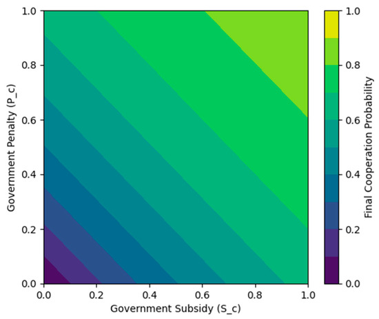 Figure 8 displays the contractor’s eventual probability of adopting digital solutions under varying levels of government subsidy Sc and penalty Pc. Lighter-colored or higher-valued contours indicate a greater fraction of contractors ultimately cooperating, whereas darker or lower-valued regions reflect scenarios in which cooperation stagnates. As illustrated, a moderate combination of subsidies and penalties often produces a “threshold effect”, beyond which the system can escape a low-level equilibrium and transition toward stable, widespread digital collaboration.