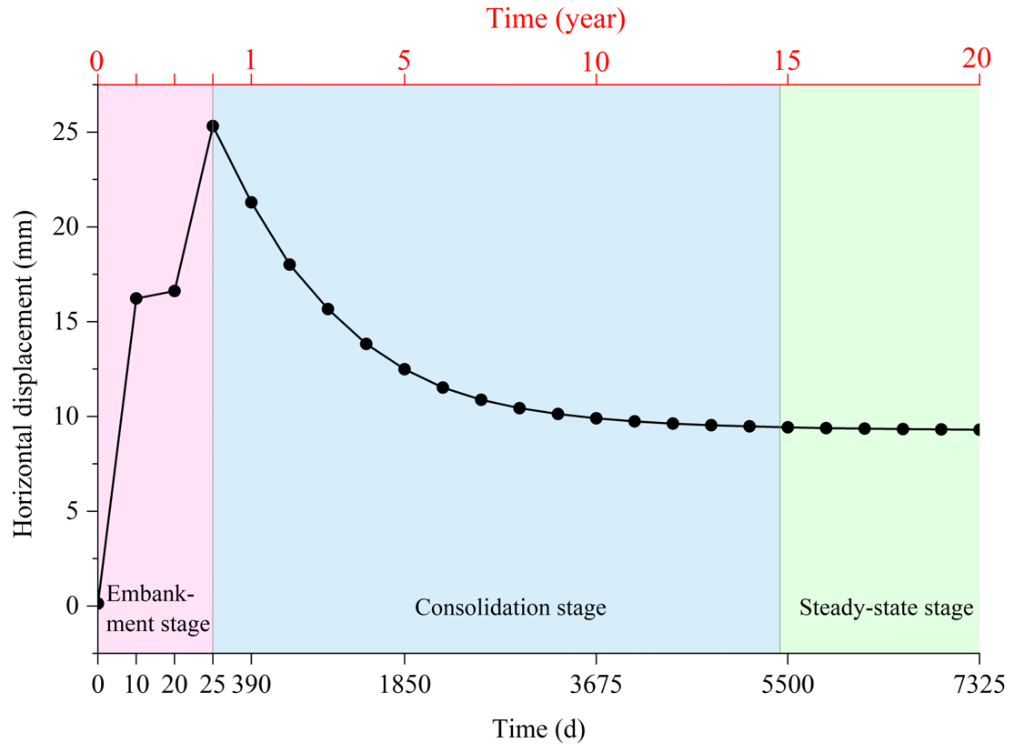- Long-term consolidation phase post-seawall construction to investigate sustained effects on bridge pile foundations. A consolidation analysis was conducted over a total duration of 20 years with annual intervals, where each yearly increment was defined as 365 days.