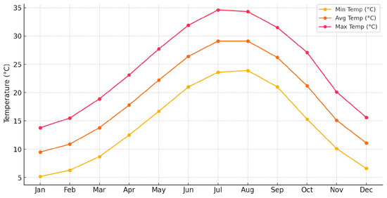 Figure 1 shows monthly average temperature and precipitation levels, illustrating the combined heat and moisture load. The summer months (June through September) receive very little rainfall while average temperatures exceed 26 °C, which necessitates thoughtful façade and shading strategies. Figure 2 demonstrates the monthly minimum, average, and maximum temperature values. The peak summer months show maximum temperatures approaching 35 °C, which confirms the thermal stress these buildings are exposed to.