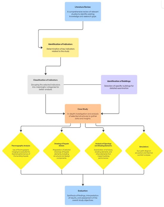 This study ensures a comprehensive analysis by integrating both qualitative and quantitative approaches. The flowchart below outlines the key steps in the research process, including the identification, analysis, and evaluation of significant indicators and case studies (Figure 3). To provide a robust and multidimensional assessment, the methodology combines computer-based simulations, thermal imaging analyses, and on-site measurements of façade elements (e.g., depth, angle, and spacing of sun breakers), as well as qualitative comparative evaluations.