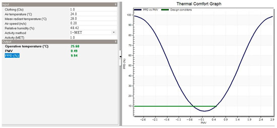 To support such evaluations, EnergyPlus offers an advanced simulation tool that assesses whether building environmental control strategies are adequate for maintaining thermal comfort [38]. In this study, DesignBuilder software was employed, which utilizes Fanger’s thermal comfort model, as illustrated in Figure 5.