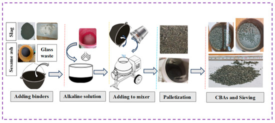 The production of CBAs in concrete has evolved through various methodologies and technological developments aimed at enhancing sustainability and reducing environmental impact [18]. Traditionally, the production of CBAs relies on high-temperature sintering. Although these methods are effective in generating durable materials, they are associated with substantial energy consumption and the release of significant quantities of carbon dioxide (CO2) [19]. Consequently, numerous challenges have been encountered in terms of energy efficiency and environmental impact. To address these challenges, researchers [20,21] have explored cold-bonding granulation techniques as alternatives for producing synthetic aggregates. This process relies on a mixture of raw materials, including recycled resources, and operates at lower temperatures, making it more energy-efficient [22]. Some challenges face the environment owing to agricultural and manufacturing waste.