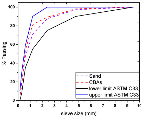 CBAs were produced using cold bonding technology. The preparation began by mixing slag, waste glass, and sesame ash homogeneously in ratios of 70:20:10. The mixture was placed in a disk pelletizer and sprayed evenly with a specified amount of water. This step was repeated until the granules reached a desired size. The preparation of CBAs using slag, potassium hydroxide (KOH), sesame ash, and recycled glass involves several steps. First, the raw materials were collected and prepared. The slag was obtained from industrial processes such as blast furnaces and dried to remove moisture. Sesame ash is produced by burning sesame waste and sifting it to obtain fine particles (less than 75 microns). Similarly, the recycled glass was crushed and screened to ensure a uniform particle size. Subsequently, the materials were mixed together. The dry materials (slag, sesame ash, and recycled glass) were mixed in specific proportions to achieve homogeneity. Next, KOH solution was gradually added to the mixture to ensure uniform wetting of the particles without forming a paste as shown in Figure 1. This mixture formed a base for granulation. The granulation process of producing CBA through disk pelletization is sequentially reproducible and scalable. The literature suggests that parameters like disk angle, rotational speed, pelletization time, and raw material makeup are sufficiently established and can be accurately controlled for consistent pellet properties across different batches. Furthermore, regression analysis performed by Kim et al. [18] confirmed a strong relationship (R2 = 0.9979) between pelletizer disk speed and corresponding size, ensuring that aggregate quality and mechanical performance remain unobstructed during scale-up from lab to pilot-scale production. This has been validated in pilot studies using pelletizers with diameters between 40 cm and 160 cm, confirming not only the repeatability of the process but also the industrial applicability of the developed method. Laboratory tests confirmed the ability of this process to produce aggregates with homogeneous bulk density, strength, and particle size distribution which confirms the reliability of the process [20]. The industrial pan granulator is utilized in this process, which is also employed by other industries including fertilizer granulation, iron ore agglomeration, and waste remediation for contaminant solidification. Such success in these industries demonstrates that the granulation process is indeed suitable for production scale levels without degrading performance or product quality. Granulated ion was performed using a rotary or a disc granulator. The mixture was fed into the granulator, and water or an additional KOH solution was sprayed to improve cohesion. The spinning process was continued until spherical pellets of desired size were formed, usually between 15 µm and 5 mm. Granulator parameters such as the angle and rotation speed were adjusted to control the size and quality of the pellets [20]. The newly formed pellets underwent pretreatment and were left to air dry for 24–48 h to obtain initial strength and stability. Subsequently, hardening occurs under natural environmental conditions. The solidification process allows for optimal chemical reactions, particularly the pozzolanic activity of sesame ash and glass with slag. After hardening, quality tests were performed on the aggregates. The compressive or endurance strength was measured to ensure mechanical durability, and the density and porosity were measured to evaluate its suitability. The particles were characterized, and the results revealed that the bulk density was 1695 kg/m3. The fineness coefficient was 2.98, which was placed in Zone II based on particle size distribution. To maintain the same properties of CBAs for all batches, a production method was established. The proportions of the ingredients (70% slag, 20% waste glass, 10% sesame ash) were kept on precision balances, and the moisture content was regulated during granulation. Granulation was carried out with the same disc pelletizer for all the active processes (disc angle, rotation speed, water spray rate) that were set in stone. Once the pellets were formed, all batches were air-dried for the same period of time (24–48 h) and in the same conditions. Aggregate batches were tested for bulk density, fineness modulus, and particle size distribution prior to usage. The accepted aggregate batches were those that met the stipulated tolerance limits defined with reference to ASTM C136/C136M [50] for sieve analysis and ASTM C29/C29M [51] for unit weight before being subjected to concrete production. The particle size distribution curves of the fine particles were also analyzed, as shown in Figure 2.