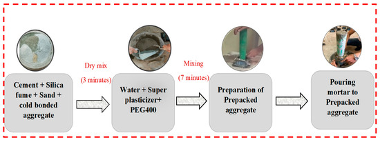 Normal or conventional concrete is made by preparing the mix of its constituent parts comprising fine and coarse aggregates, cement, water, and any admixture uniformly and pouring the mix into intended molds [43]. However, concrete can be alternatively prepared by applying prepacking of coarse aggregates into a mold and then injecting cement mortar to fill the spaces between the packed aggregates [44,45]. This two-stage or prepacked-concrete method was first introduced in the 1930s [46]. This method is particularly suitable for constructing structural elements with complex reinforcement or in situations where traditional formwork disrupts the designed frames, such as the presence of pipes or openings [47]. In addition, this approach is suitable for large concrete works, such as bridge piers and piers, as well as underwater concrete works. In addition to the differences in production mechanisms, there are significant differences between traditional and prepackaged concrete [45]. This method effectively addresses coarse aggregate dispersion problems, particularly in heavy aggregate concrete. Furthermore, prepackaged concrete does not require mechanical vibration, compaction, or other compaction methods to achieve a fine dense structure, resulting in lower production costs [46,47,48].