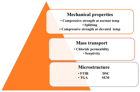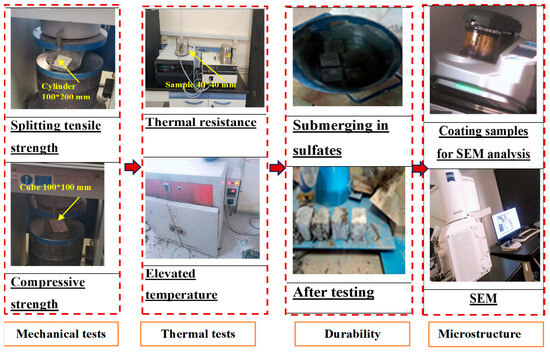 Standard testing procedures were used to assess the compressive strength of the concrete, which was tested according to ASTM C109 criteria [55]. For each concrete mix, three cube specimens of 10 × 10 × 10 cm3 were fabricated and evaluated for compressive strength at curing intervals of 7, 28, and 90 days. The experiments were conducted employing an ELE compression testing apparatus of 3000 KN loading capacity. The splitting tensile strength was measured in accordance with ASTM C496 [56] employing cylindrical specimens of 10 cm × 20 cm. The average of three specimens was calculated to ensure accuracy and consistency in the outcome. Concrete durability testing in this study was conducted in accordance with specific procedures of relevant standards. The evaluation of sulfate resistance was carried out by soaking the specimens in a 5% sodium sulfate (Na2SO4) solution followed by the determination of compressive strength based on ASTM C109/C109 M-21 [55]. Chloride penetration resistance was evaluated through immersion in a 3.5% sodium chloride (NaCl) solution, and subsequent compressive strength testing was carried out using an immersion-based method rather than electrical conductivity methods. Thermal resistance was evaluated by subjecting specimens to 300 °C and 600 °C for 2 h in a furnace under controlled conditions simulating fire exposure as cited in previous studies involving concrete exposed to high temperatures. All of these methods met the concrete’s required chemical and thermal stressors for durability assessment. Sorptivity tests were tested to assess the endurance of the concrete following ASTM [57], using cylindrical specimens with dimensions of 10 cm × 5 cm. Before testing, the materials were dried in an oven at 105 °C and separated from the external sources. The penetration of chloride ions was measured after 28 days by submerging the specimens in a 3.5% sodium chloride (NaCl) solution, while the sulfate resistance was examined by exposing the samples to a 5% sodium sulfate (Na2SO3) solution to observe the strength degradation. Moreover, the thermal resistance of the concrete was measured by subjecting the specimens to elevated temperatures of 350 °C and 700 °C to study the impact of extreme heat on the material performance. A microstructural analysis was conducted using scanning electron microscopy (SEM) to investigate the internal morphology of the concrete. Thin slices, approximately 1 × 1 cm in size, were extracted from the cores of the crushed cube specimens for this analysis. SEM observations were performed using a Philips XL 30 microscope to examine the distribution and characteristics of the hydration products and to detect potential microstructural flaws. DSC, TGA, and FTIR analyses were conducted for microstructural analysis. Figure 4 summarizes the testing. Figure 5 illustrates the test procedure.