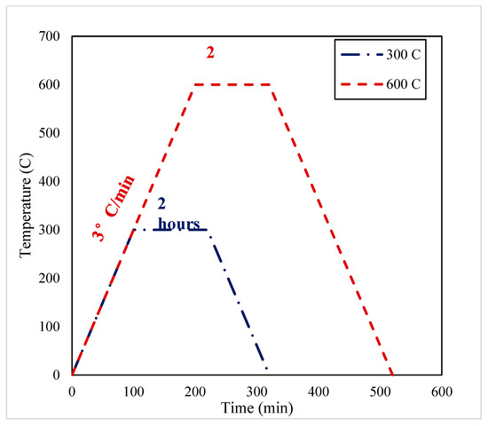The temperature was pre-raised and constant heating was performed at 3 °C in a closed electronic oven. The separation was approximately 20 and was not delayed. For example, experiments on concrete construction and target temperatures of 300 and 600 °C were chosen. The samples were maintained at the target temperature for 2 h to achieve a homogeneous thermal condition. Figure 6 illustrates the relationship between temperature and exposure time over different periods. The oven was turned off after each heating cycle to reduce the effect of the temperature gradient. The samples were left to cool gradually, and the door was closed. The next steps of the analysis were prepped following the achievement of room temperature with the samples.