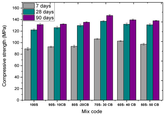 At 28 d, the reference mix recorded a compressive strength of 122.19 MPa. At the replacement ratio of 10% (90S-10CB), the strength increased to 126.16 MPa, representing an improvement of 3.25%. With a replacement ratio of 20% (80S-20CB), the strength increased to 129.83 MPa, an improvement of 6.25%. At a replacement ratio of 30% (70S-30CB), the strength reached 137.28 MPa, representing an improvement of 12.34% owing to the continued hydration and pozzolanic reactions. 132.1 MPa (8.10% improvement) and 131.03 MPa (7.24% improvement) at 40% and 50% replacement ratios, respectively. A reduction in compressive strength with an increasing replacement ratio indicates that although the pozzolanic and alkali–silica interactions are effective, high ratios of pre-packed aggregates may disrupt the matrix structure [47].