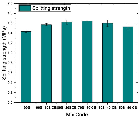 The results in Figure 8 demonstrate the split tensile strength of UHPC containing CBAs as sand substitutes, with replacement ratios ranging from 10% to 50%. The splitting tensile strength was measured for the standard mixture 100S (no replacement) and partial replacement mixtures 90S-10SCB, 80S-20SCB, 70S-30CB, 60S-40CB, and 50S-50CB.