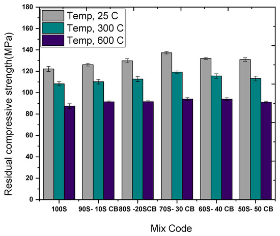 The results in Figure 9 show the compressive strength of UHPC containing CBAs as sand substitutes at different temperatures (25, 300, and 600 °C). Six different mixtures were analyzed: 100S (standard mixture without replacement), 90S-10SCB, 80S-20SCB, 70S-30CB, 60S-40CB, and 50S-50CB. At room temperature (25 °C), the standard mixture (100S) exhibited a compressive strength of 122.19 MPa, which increased with CBAs. At a replacement ratio of 10% (90S-10SCB), the compressive strength increased to 126.16 MPa, an improvement of 3.2%. With a replacement ratio of 20% (80S-20SCB), the strength increased to 129.83 MPa, an improvement of 6.3%. The highest compressive strength was observed at a 30% replacement ratio (70S-30CB), reaching 137.28 MPa, representing a 12.3% improvement over that of the standard mixture. At the replacement ratios of 40% and 50% (60S-40CB and 50S-50CB), the compressive strengths reached 132.10 MPa (8.1% improvement) and 131.02 MPa (7.2% improvement), respectively. After being subjected to a temperature of 300 °C, all mixtures lost compressive strength relative to that at room temperature because of the thermal deterioration of the concrete matrix [65]. The strength of the standard mixture decreased to 108.28 MPa, representing an 11.4% decrease compared to its value at room temperature. The standard deviation was calculated to be ±2 MPa. Likewise, at 10% and 20% replacement ratios (90S-10SCB and 80S-20SCB), the strength decreased to 110.28 MPa and 112.71 MPa, representing a decrease of 12.6% and 13.2%, respectively, compared to their values at room temperature.
