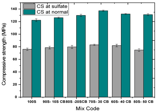 The experimental results in Figure 10 illustrate the compressive strength performance of the UHPC containing CBA as a partial replacement for sand. The measurements were taken after 28 days under standard curing conditions and following exposure to a 3.5% sodium sulfate solution. The study included six mixed designs: 100S, 90S-10SCB, 80S-20SCB, 70S-30CB, 60S-40CB, and 50S-50CB. Under normal conditions, the compressive strength ranged between 122.18 MPa for the 100S mix (reference mix) and 137.28 MPa for the 70S-30CB mix with a standard deviation of ±1.5 MPa, demonstrating enhancement in strength up to a 30% replacement level. Thereafter, a minor decrease in strength was noted when the 50S-50CB mixture attained a compressive strength of 131.03 MPa. Under sulfate exposure conditions, the compressive strength of all mixtures was reduced because of the adverse effects of sodium sulfate on matrix integrity. The residual strength ranged between 74.80 MPa for the 50S-50CB mixture and 83.05 MPa for the 70S-30CB mixture with a small standard deviation of ±2 MPa, highlighting the superior performance of the latter in maintaining strength under aggressive environments. The results show that replacing sand by up to 30% with CBA improves the sulfate resistance and mechanical properties of high-performance concrete. The results highlight the effect of the CBA replacement levels on the compressive strength (CS) of UHPC under normal and sulfate exposure conditions. The reduction factor, which represents the relative decrease in compressive strength owing to sulfate attack [73,74,75,76], ranged from 37.8% for the reference mix (100S) to 42.9% for the mix with the highest CBA content (50S-50CB). A consistent trend was observed, with the decline factor increasing as the CBA substitution levels increased. At low substitution levels (100S to 70S-30CB), the sulfate resistance was relatively high, likely because of the high matrix density and low porosity, which limited the penetration of sulfate ions. The mixture 70S-30CB showed the best performance, with a reduction factor of 39.5%. However, sulfate resistance decreased at high replacement levels (60S-40CB and 50S-50CB). This can be attributed to the increased porosity and weak CB in the matrix resulting from the high percentage of CBAs [18,77], which allows sulfate ions to penetrate more quickly and cause more significant damage [78]. These reactions include the formation of ettringite and gypsum, which decalcifies C-S-H, resulting in a decrease in the compressive strength. These results highlight the need to balance sustainability goals with durability considerations when designing UHPC mixtures.