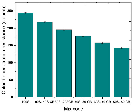 The results in Figure 11 show an improvement in the chloride penetration resistance in UHPC with an increasing proportion of CBA, indicating an improved performance with gradual replacement of the conventional aggregate. The reference mixture (100S) exhibited the largest chloride penetration depth (244 coulombs), whereas increasing the proportion of CBAs gradually reduced the penetration depth: 10% CB (217 coulombs, ~11% improvement), 20% CB (196 coulombs, ~20% improvement), 30% CB (177 coulombs, ~20% improvement) 27%), 40% CB (158 coulombs, ~35% improvement), and 50% CB (143 coulombs, ~35% improvement ~41%). The standard deviation was found to be 2. This improvement was attributed to the properties of CBAs made from sesame ash and waste glass, which may contribute to reduced permeability through improved microscopic density and increased pozzolanic interaction between the aggregate and matrix [79]. These results indicate that high performance can be achieved with higher substitution levels (30–50%), with further improvement possible by optimizing the manufacturing process and using additives to enhance chemical reactions within the matrix.