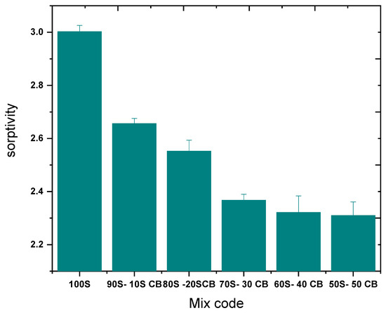 The results shown in Figure 12 explain a significant reduction in sorptivity as the proportion of CBA used as a replacement for natural sand increased. This trend indicates the enhanced durability of UHPC when CBA is incorporated under self-curing conditions with a pre-packed aggregate system. The absorption improvement rate, which was calculated for the 100S mixture, provides additional insight into the efficiency of CB use. For the 90S-10CB mixture, the absorption rate decreased by approximately 11.55% compared to that of 100S. The 80S-20CB mixture achieved a reduction of 14.98%, whereas the 70S-30CB mixture exhibited a greater improvement of 21.2%. This trend continued with the 60S-40CB and 50S-50CB mixtures, which achieved reductions of 22.7% and 23.1%, respectively. These results highlight a decreasing rate of improvement as the CB content increases beyond 30%, indicating that the density and remobilization effects resulting from replacing sand with CB begin to stabilize. This behavior indicates that while replacing sand with CB enhances the matrix density and reduces capillary porosity [80], there is an optimal replacement level, perhaps around 30–40%—where the benefits of reducing the absorption rate are most apparent. After this point, the effect of adding CB to reduce the absorption rate becomes marginal [45].