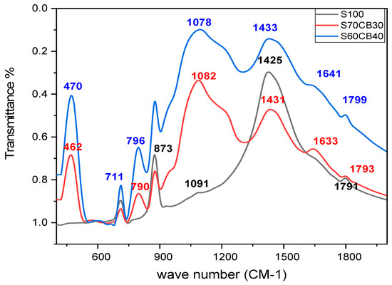 Figure 13 shows the FTIR spectra, indicating the transmittance of UHPC containing CB prepared using sesame ash and waste glass in different proportions, denoted as S100, S70CB30, and S60CB40. Representing S100, distinctive peaks were observed at 796.56, 1076.21, 1433.02, 1641.32, and 1799.48 cm−1. This was due to the bending vibrations of the Si–O–Si bond, stretching of the Si–O bond, and carbonate groups. The addition of sesame ash and waste glass to samples S70CB30 and S60CB40 led to noticeable changes in the locations and intensities of these peaks of 482.88, 711.69, 1082.00, 1431.09, 1633.61, 1793.49 at S70CB30, and 473.70, 790.76, 1091.64, 1425.31, 1631.61, and 1791.76 cm−1. The peaks appeared especially at 1082.00 cm−1 and 1425.31 cm−1, reflecting enhanced silicate polymerization and increased formation of carbonate compounds as a result of the pozzolanic activity of sesame ash and the high content of amorphous silica in waste glass [81]. The peaks in the range 790–800 cm−1 and 1633–1793 cm−1 indicate the formation of C-S-H and calcium carbonate, which indicates improved hydration reactions and increased carbonation in high-performance concrete with a higher proportion of CBAs. Adding sesame ash and waste glass to CBA improves the microstructure of concrete and enhances its chemical stability, density, and durability.