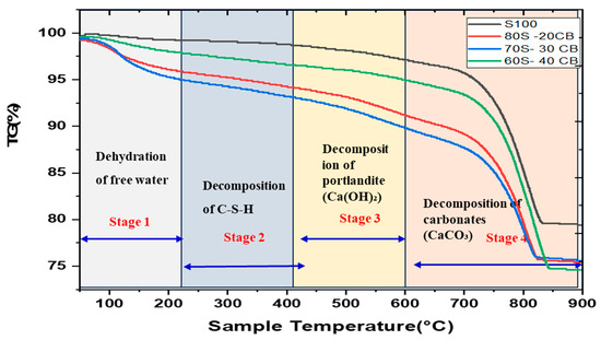 In the second stage, the decomposition of the C-S-H compound, Sample S100, showed less weight loss, indicating that it contained the lowest proportion of hydrated compounds. Conversely, as the CB content increased, the weight loss increased, indicating that CB promoted the formation of C-S-H or affected the hydration process.